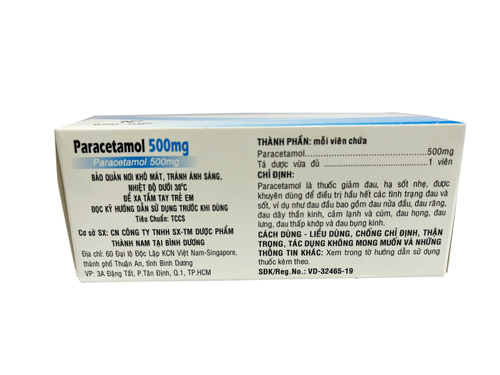 Thành phần dược chất: Paracetamol ……………………………… 500 mg