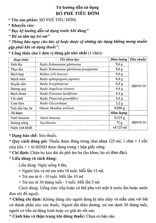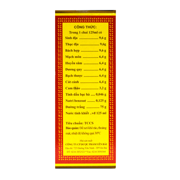 | Hoạt chất - Hàm lượng | Sinh địa, Thục địa, Bách hợp, Mạch môn, Huyền sâm, Đương quy, Bạch thược, Cát cánh, Cam thảo, Tinh dầu bạc hà |