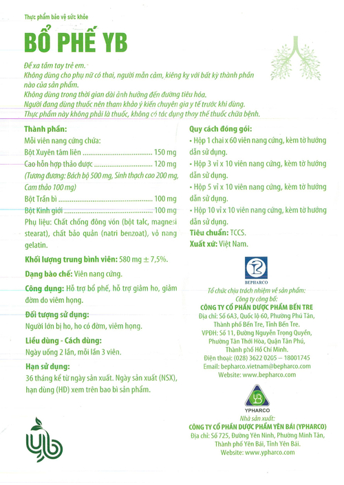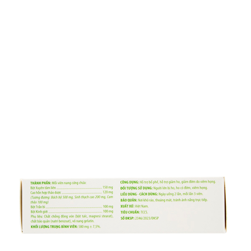 Hoạt chất - Hàm lượng | Bột Xuyên tâm liên 150 mg; Cao hỗn hợp thảo dược 120 mg (Tương đương: Bách bộ 500 mg, Sinh thạch cao 200 mg, Cam thảo 100 mg); Bột Trần bì 100 mg; Bột Kinh giới 100 mg |