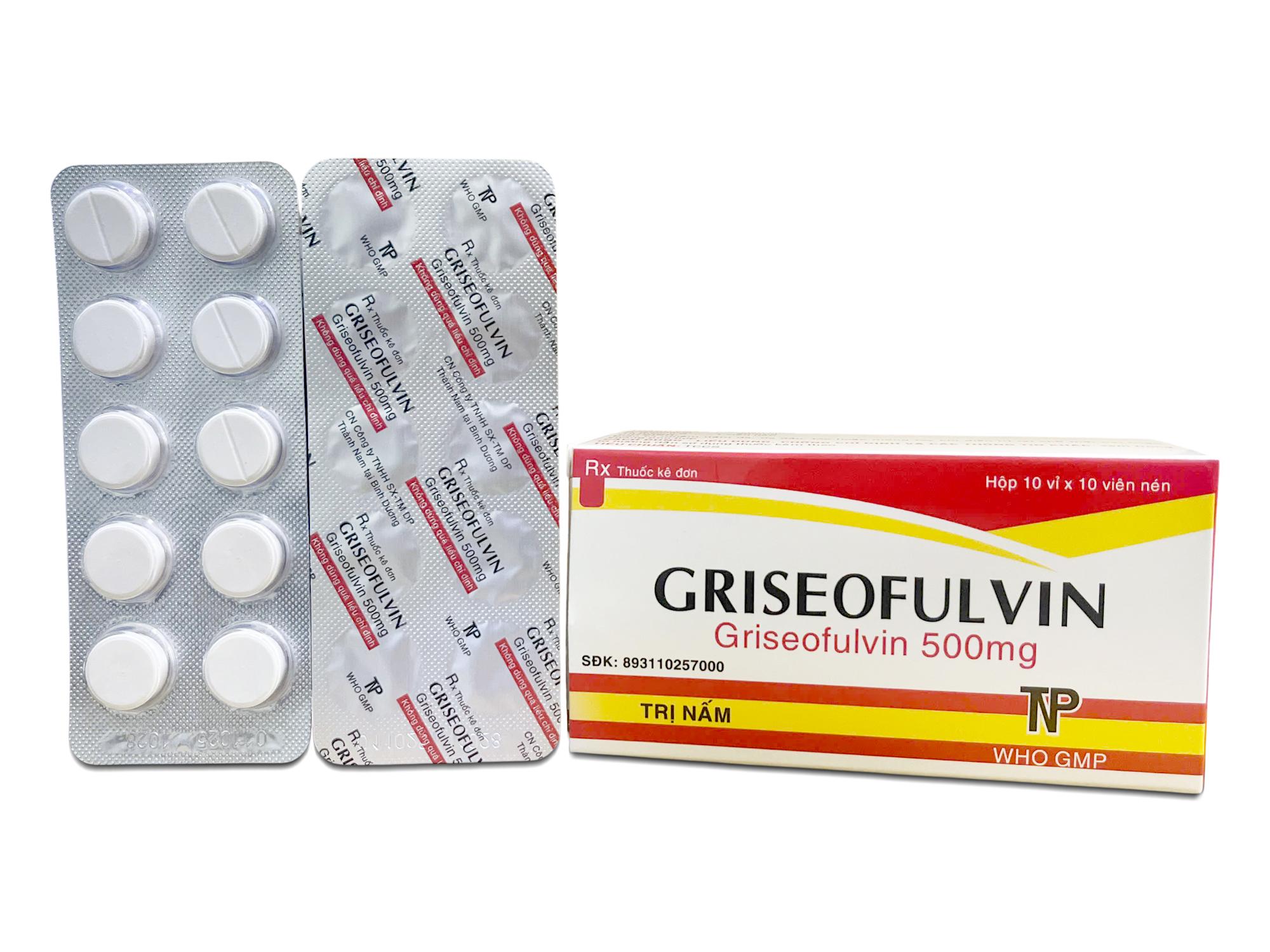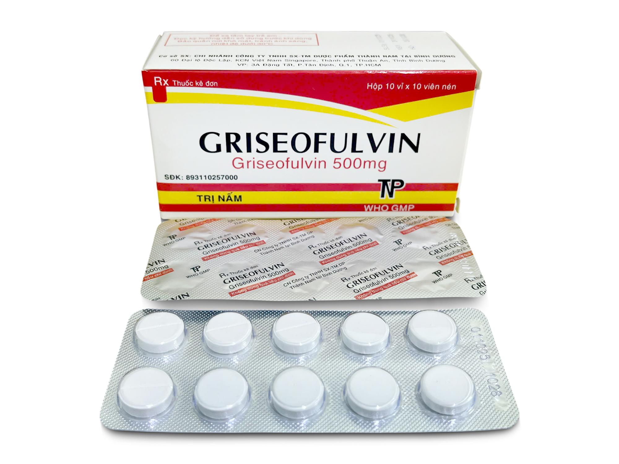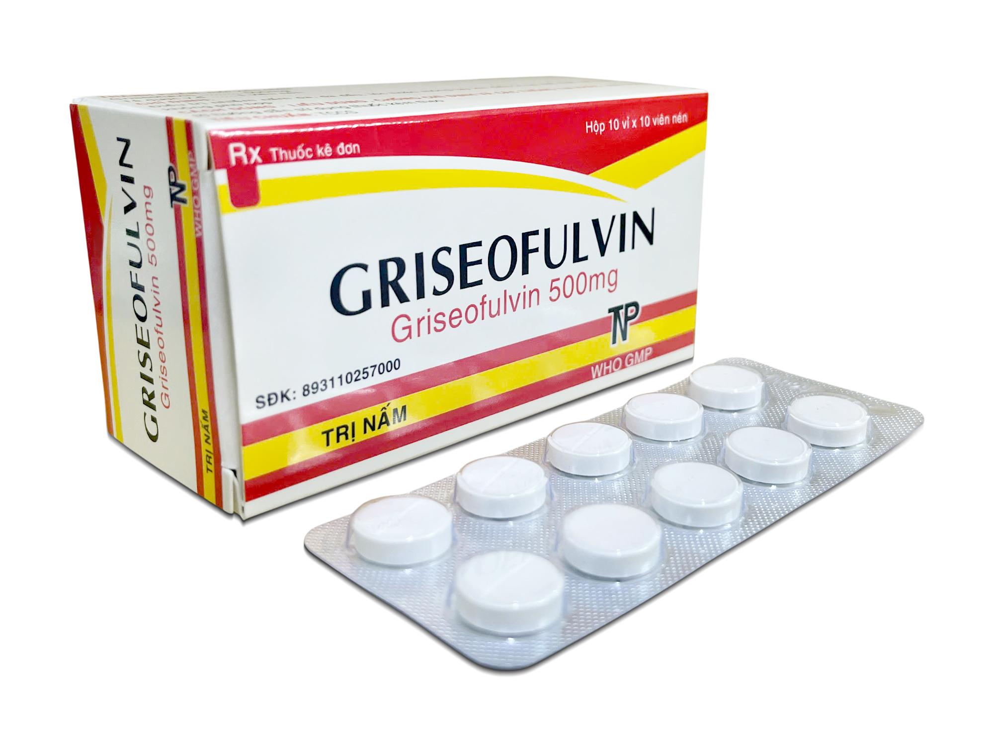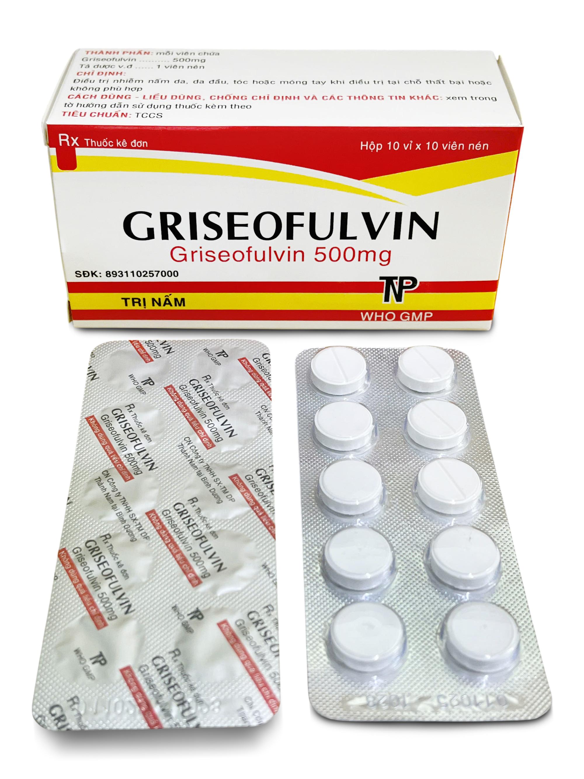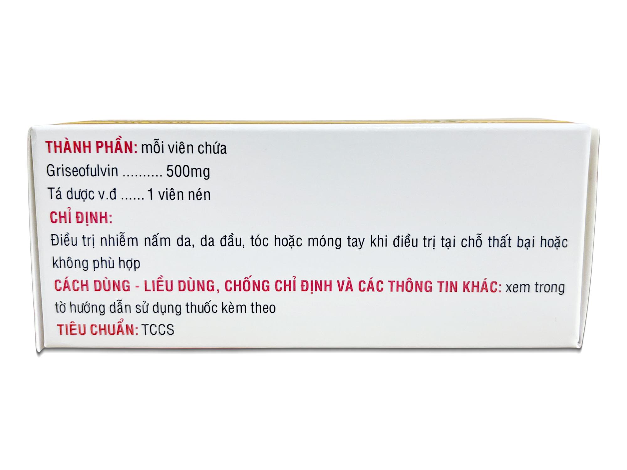 Thành phần dược chất: Griseofulvin ………………….. 500 mg Thành phần tá dược: Avicel PH101, PVP. K30, Natri starch glycolat, Magnesi stearat, Talc