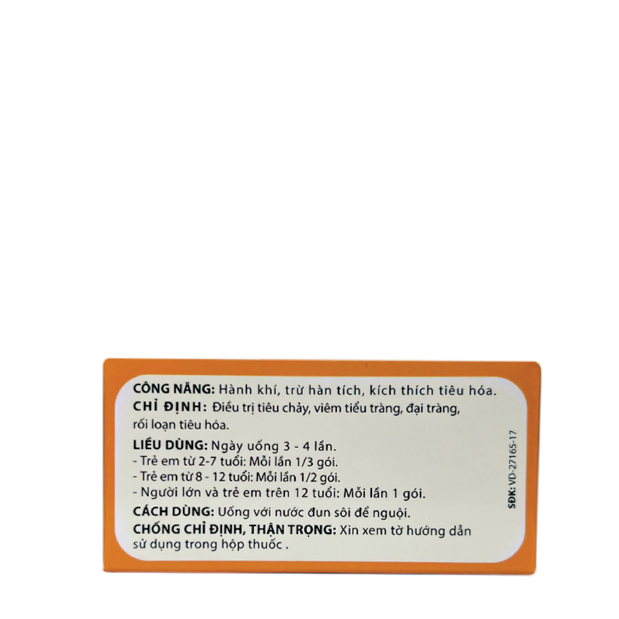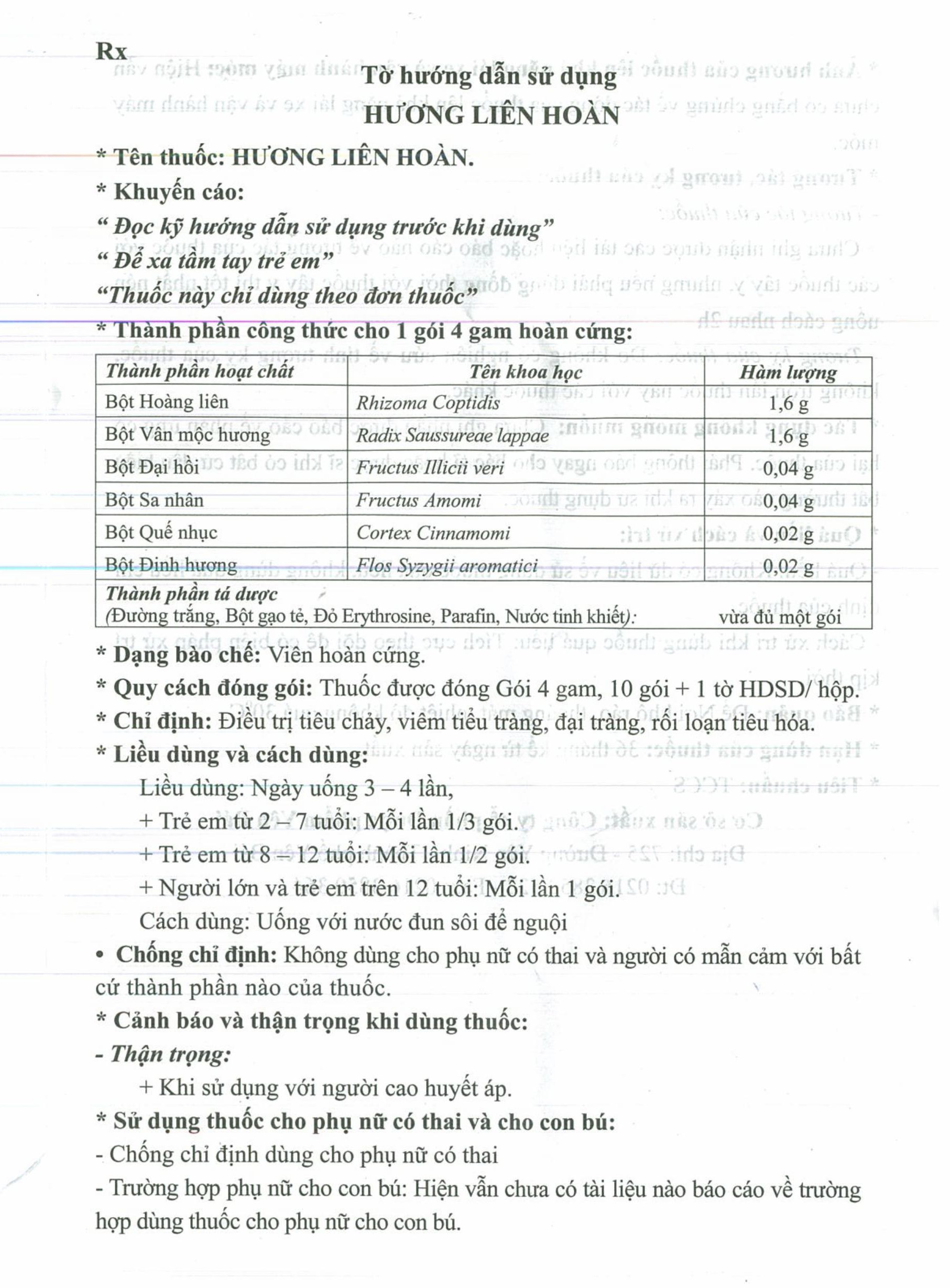 | Hoạt chất - Hàm lượng | Hoàng liên, Vân mộc hương, Đại hồi, Sa nhân, Quế, Đinh hương |