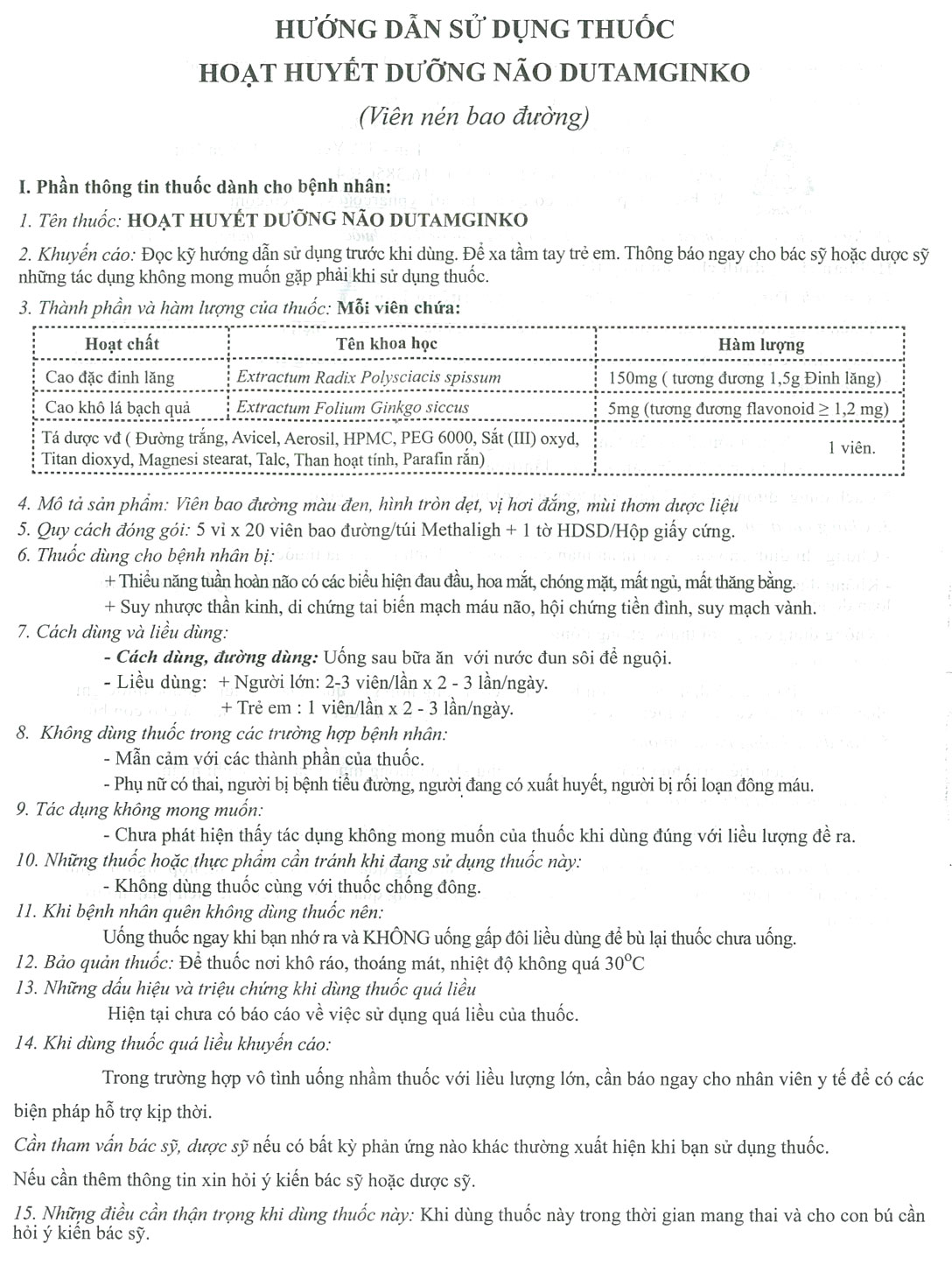| Hoạt chất - Hàm lượng | Đinh lăng, lá Bạch quả |