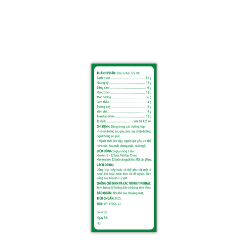 | Hoạt chất - Hàm lượng | Bạch truật, Hoàng kỳ, Đẳng sâm, Phục thần, Mộc hương, Toan táo nhân, Đương quy, Viễn chí, Cam thảo |