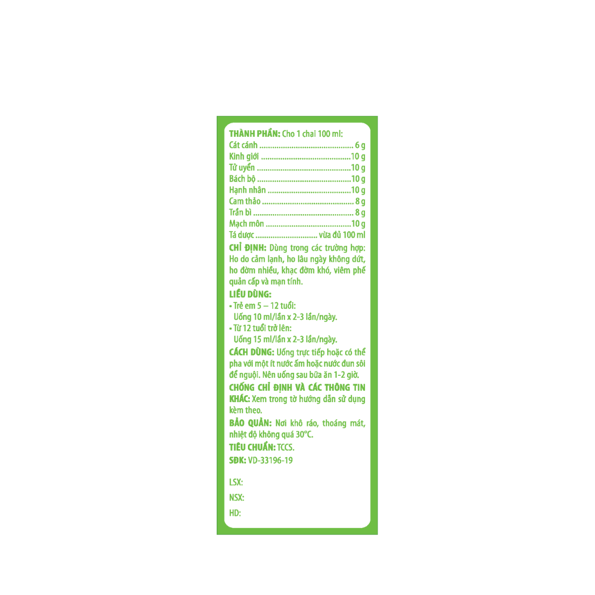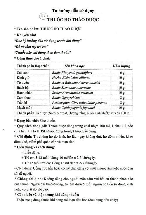 | Hoạt chất - Hàm lượng | Cát cánh, Kinh giới, Tử uyển, Bách bộ, Hạnh nhân, Cam thảo, Trần bì, Mạch môn |
