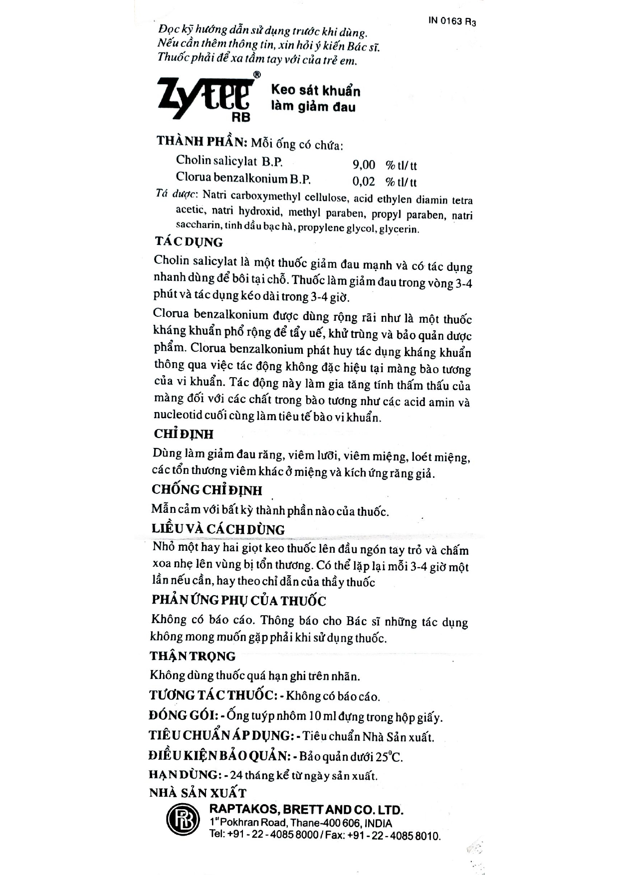 Hoạt chất - Hàm lượng: | Cholin salicylate 9% Clorua benzalkonium 0.02% |