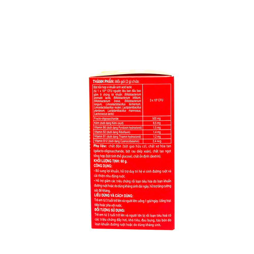 Bột hỗn hợp vi khuẩn sinh acid lactic: 3 tỷ CFU từ 10 tỷ CFU nguyên liệu ban đầu bao gồm 9 chủng lợi khuẩn: Bifidobacterium animalis lactis, Bifidobacterium bifidum, Bifidobacterium breve, Bifidobacterium longum,Limosilactobacillus fermentum, Limosilactobacillus reuteri,Lactiplantibacillus plantarum, Lactiplantibacillus rhamnosus, Lactococcus lactis.