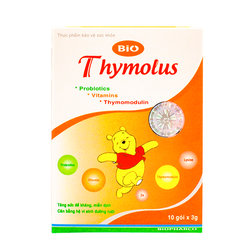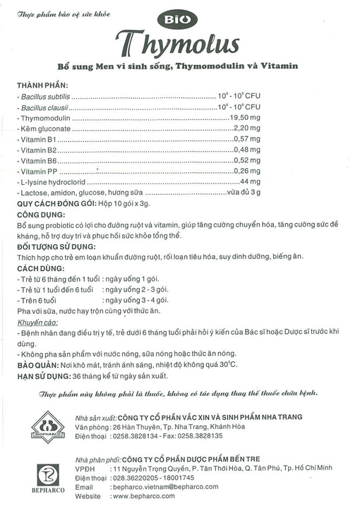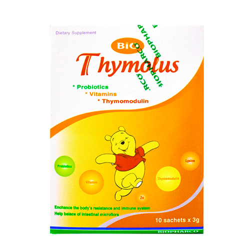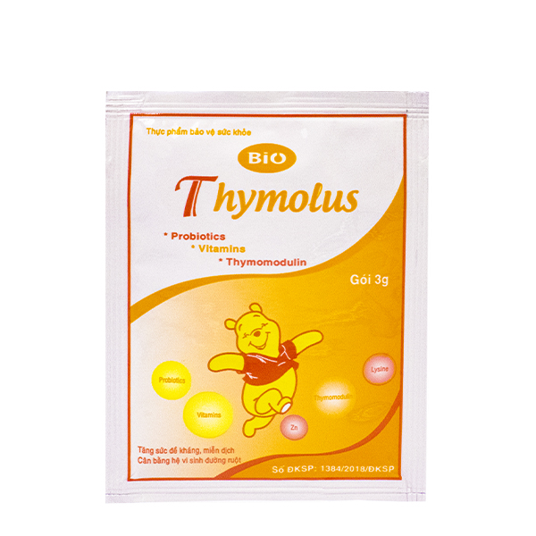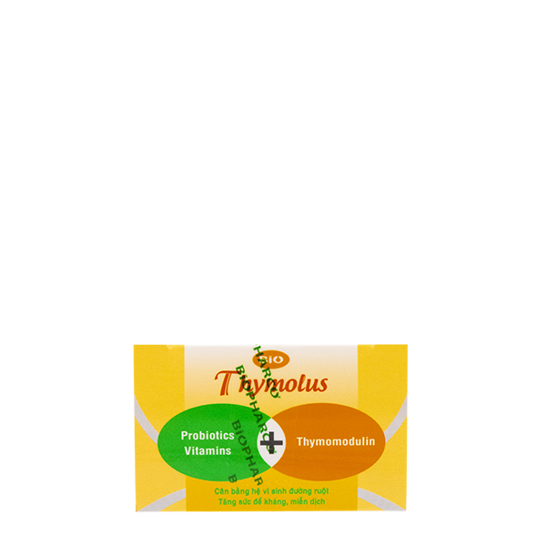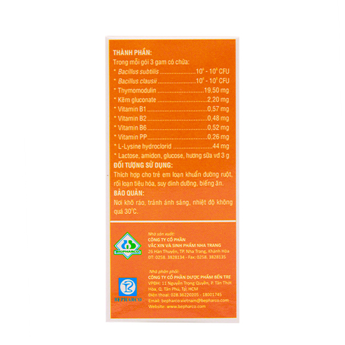 Hoạt chất - Hàm lượng | Bacillus subtilis...106 – 108 CFU Bacillus clausii...106 – 108 CFU Thymomodulin 19,5 mg; Kẽm gluconate 2,2 mg; Vitamin B1 0,57 mg; Vitamin B2 0,48 mg; Vitamin B6 0,52 mg; Vitamin PP 0,26 mg; L-lysine hydroclorid 44 mg |